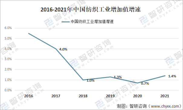 2016-2021年中國紡織工業(yè)增加值增速