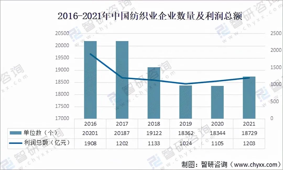資料來源:智研咨詢整理 二、紡織企業(yè)經(jīng)營現(xiàn)狀 1、企業(yè)數(shù)量 2016-2020年中國紡織業(yè)企業(yè)數(shù)量呈下降式走勢,2021年中國紡織業(yè)企業(yè)數(shù)量增加至18729個(gè),同比增長2.1%;紡織業(yè)企業(yè)利潤總額為1203億元,同比增長8.8%。