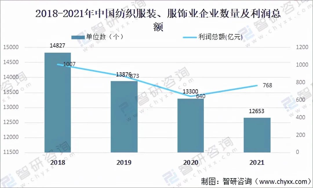 資料來源:國家統(tǒng)計(jì)局、智研咨詢整理 其中2021年中國紡織服裝、服裝業(yè)企業(yè)數(shù)量為12653個(gè),同比下降4.9%;紡織服裝、服裝業(yè)企業(yè)利潤總額為768億元,同比增長19.9%。