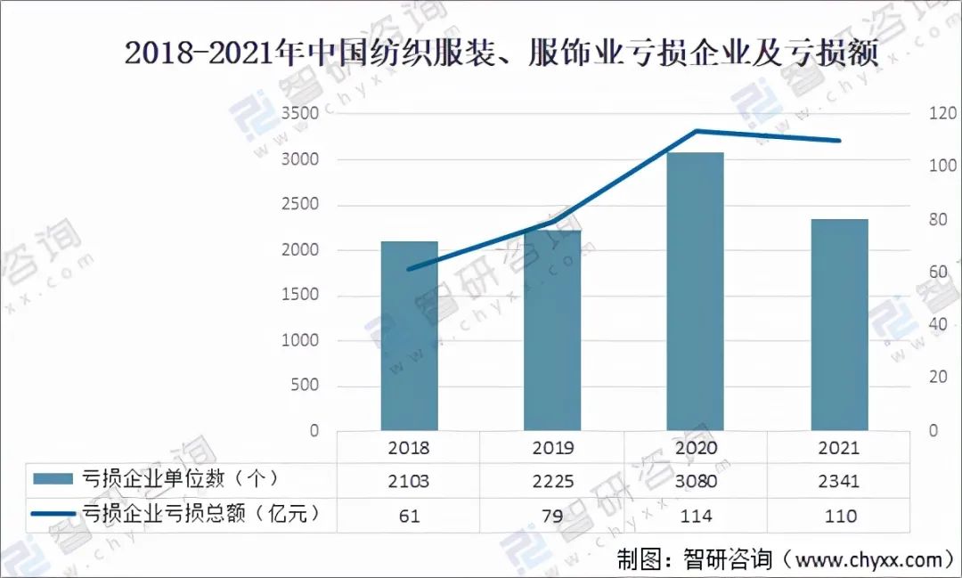 資料來源:國家統(tǒng)計(jì)局、智研咨詢整理 其中2021年中國紡織服裝、服裝業(yè)虧損企業(yè)數(shù)量為2341個(gè),同比下降24%;中國紡織服裝、服裝虧損金額為110億元,同比下降3.2%。